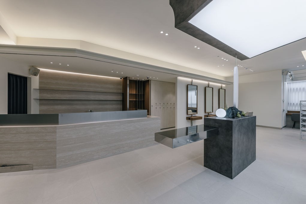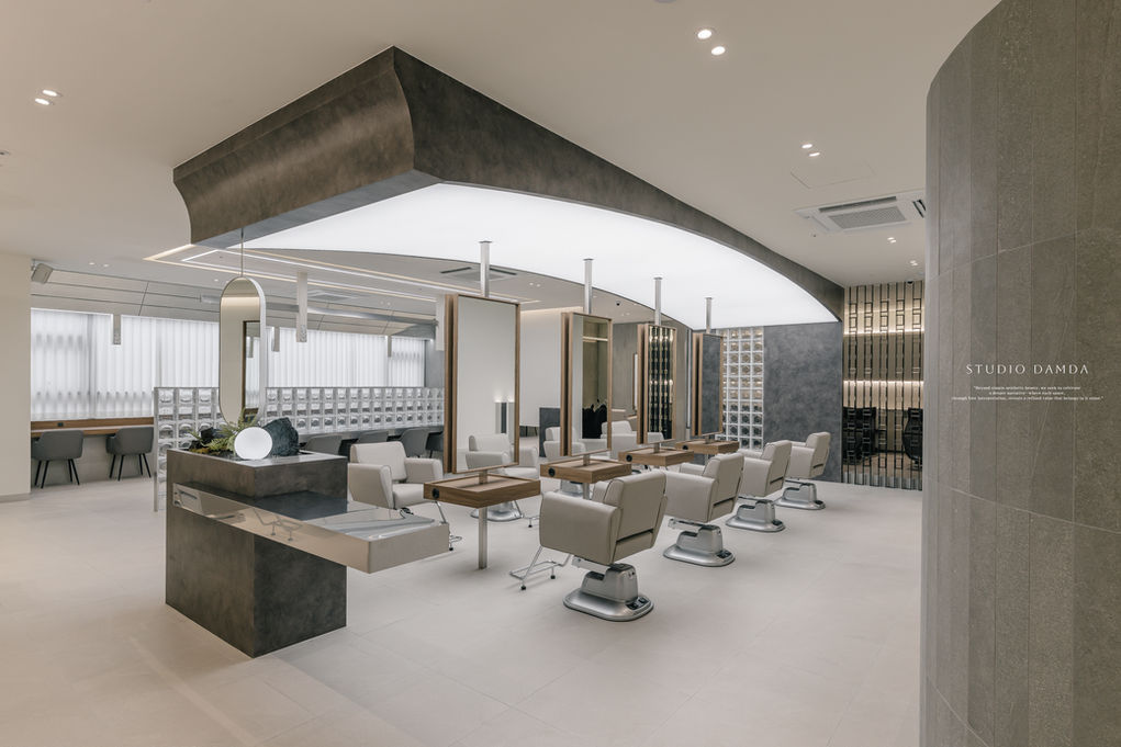 This space begins with a single curve, gently descending from the ceiling while holding light within itself. As it wraps around the styling counter, it quietly defines the center of the space without declaration. The arch exists not as a wall, but as a structure shaped by light rather than mass or enclosure. It gathers the eye naturally, maintaining presence without becoming dominant or imposing. Beneath it, the counter moves beyond its functional role, becoming a composed scene that softly embraces those who pause within it. The space favors breathing room over ornament, allowing moments to unfold without visual pressure. Materials are refined in calm, muted tones, creating a composed and steady atmosphere. Light flows gently along each form, revealing the texture and depth of the space without emphasis. Nothing seeks to stand out, allowing balance and rhythm to remain the focus throughout. A.mood hair speaks of a place where emotion arrives before technique, and where the aftertaste of a moment lingers longer than the moment itself.
